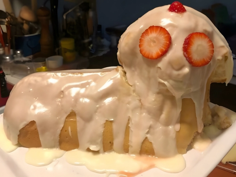 The Appearance: The cake's shape resembles a lamb, but the addition of bright red strawberry eyes gives it a strangely haunting look, making it seem as if it’s watching you.
