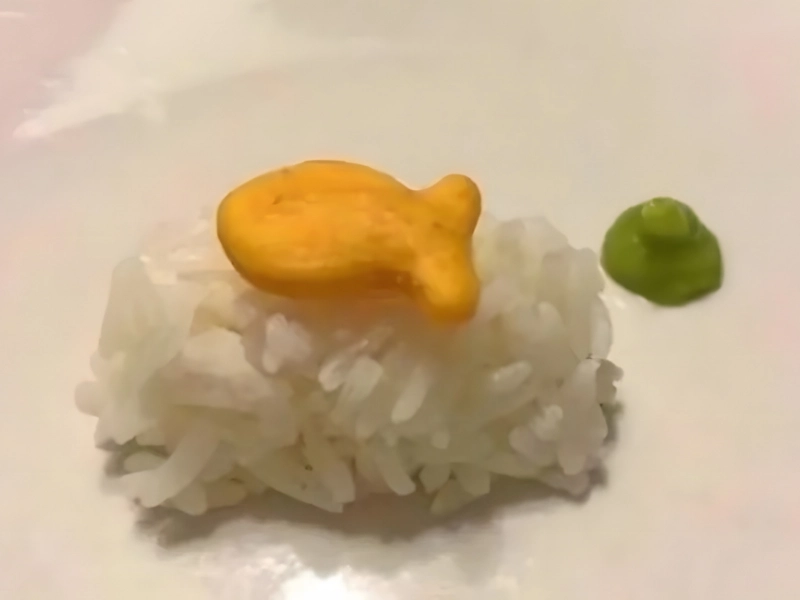 The Ingredients: The dish consists of a simple combination: a dab of wasabi, white rice, and a goldfish, which raises eyebrows about its suitability as sushi.